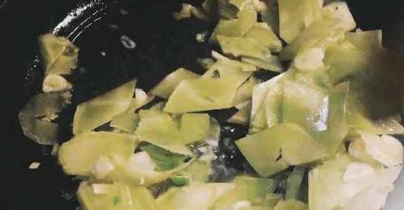 3、锅内放少量的油,加入切好的葱姜蒜爆香,随后将切好的青笋片放入煸炒,炒到青笋片基本成半熟的状态