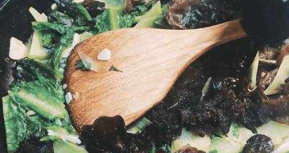 4、然后将焯好水,并且应该水分的木耳放入锅中,加入适量的盐生抽,翻炒均匀,这道青笋炒木耳就大功告成了,这道菜谱是不是非常的简单快手?