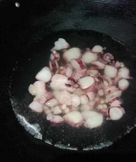 锅里倒入一大碗的清水,倒入切好的章鱼足,大火焯水,把章鱼足焯水3分钟,3分钟后即可捞出来了。