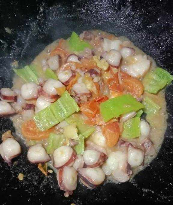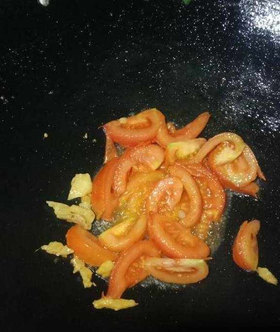 另外再起锅,起锅烧油,放入西红柿块,生姜,爆炒出西红柿汁,再放入章鱼足,青椒,蚝油,生抽,白糖,翻炒片刻,加入少许的清水,这样章鱼足会更加的鲜嫩,大约翻炒了2分多钟,加入盐,鸡精,继续翻炒一会儿,就准备出锅吧!