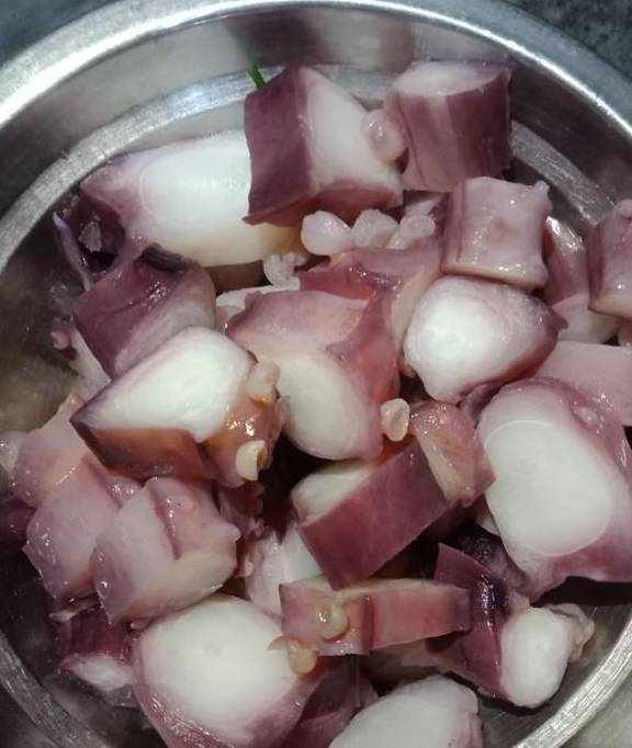首先,我们需要把冷冻过的章鱼足,用清洗浸泡式清洗干净,用刀切成大小合适的小块,全部都切好了,备用着。