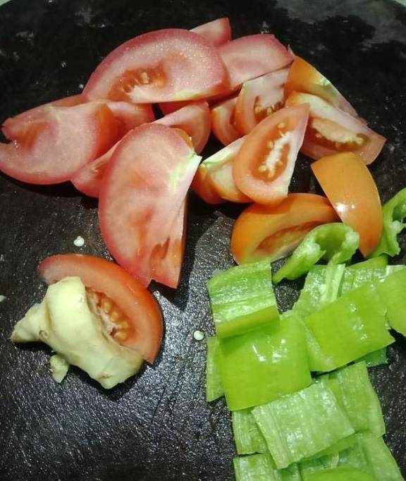 章鱼足烹饪时,最好调节的配菜就是西红柿和青椒了。把西红柿和青椒清洗干净,切成小块,备用着。另外,再来弄点生姜丝。