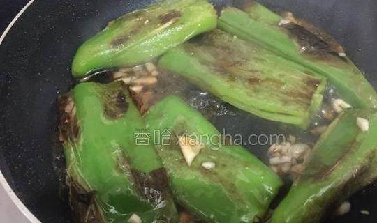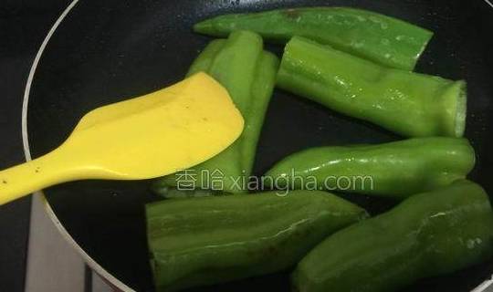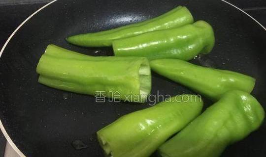 5.将尖椒放入锅中煎至。
