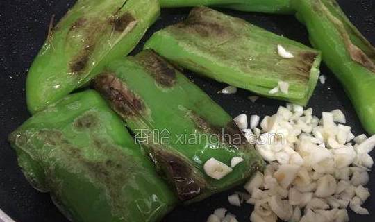 7.煎至尖椒表面都有皱纹了,放入蒜末煸香。