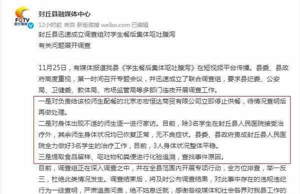 河南电视台《都市报道》报道,这个月的23号,河南新乡封丘县赵岗镇戚城中学的学生们吃了学校的营养餐后,