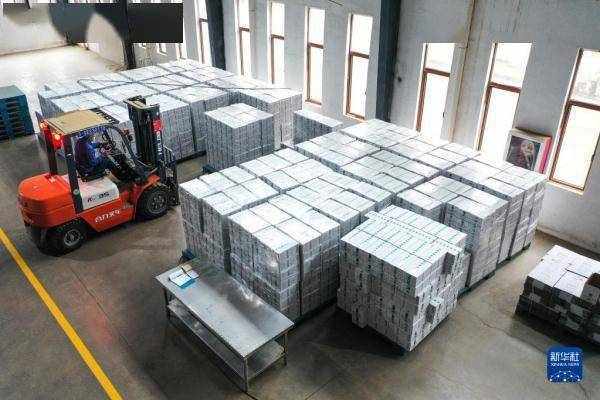 2月22日,贵州省普安县茶源街道一家茶企的工人在搬运将出口俄罗斯的茶叶(无人机照片)。