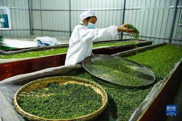 2月23日,贵州省普安县茶源街道一家茶产业合作社的工人在摊晾茶青。