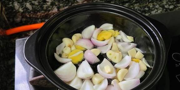 从石锅中取出,倒入少许食用油,加入葱末和姜,炒至变软。