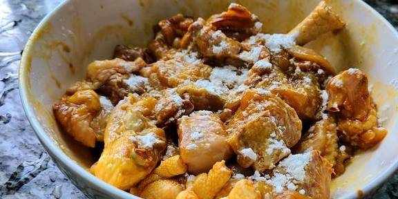 1。事先准备好整只鸡,将鸡胸肉切成一小片,放入盘中,腌好,加入酱油,一汤匙油,少量白胡椒粉,然后加入30克食盐,30克鸡粉,30克鸡粉,然后搅拌均匀。拌匀,加入一茶匙木薯粉,拌匀,腌30分钟,即可品尝。(烤鸡粉是咸的,所以不要加盐,只要在里面加一层栀子花黄盐调味,量30克就可以起到咸蛋黄的作用)1.我们可以根据他们的口味来调整