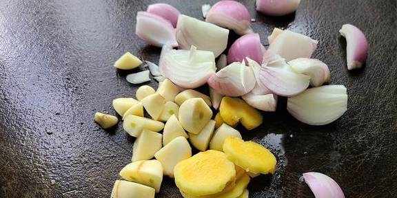 提前准备4个小洋葱,1个大蒜和1个姜饼,切成小块放在一边。