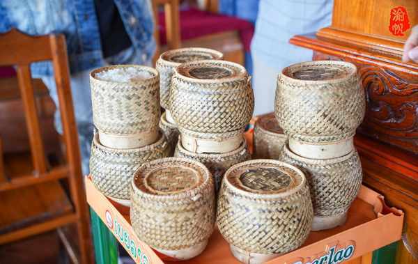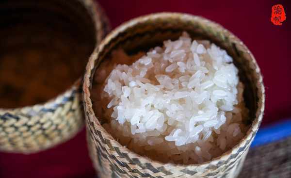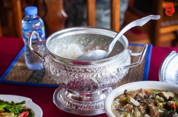 除了糯米的特色以外,他们蒸饭的器具也很特别,单独的小碗是用竹子蔑条编制的,吃起来还有竹子的清香;如果不吃糯米饭,也有粘米饭,却是用银器盛装的,很是特别。