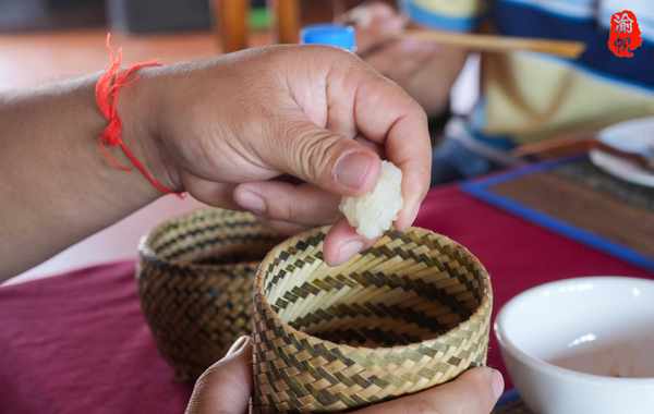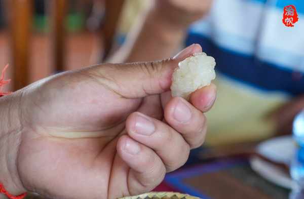 不仅如此,米饭的吃法还有讲究,据当地朋友介绍,他们在用餐时不用筷子,而是用洗干净的手从饭盒内抓起一团糯米饭,捏成一团,另一只手再从这饭团中捏出一小团,然后配合大拇指夹菜,把饭菜一起送入嘴里。