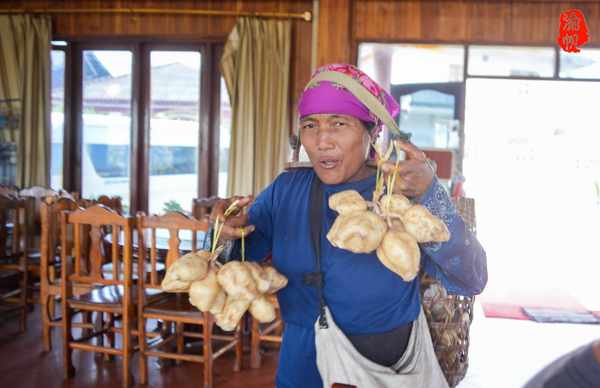 在我们吃饭的过程中,一位老阿姨过来兜售地瓜,价格到是不贵,10000元一把(大约有十来个),最主要的是他背背蒌的方式很特别,不是背在肩膀上,而是将带子套在头上,两边再各用一块木板抵在脖子上,看起来受力点反而在脖子上,真有点不可思议。