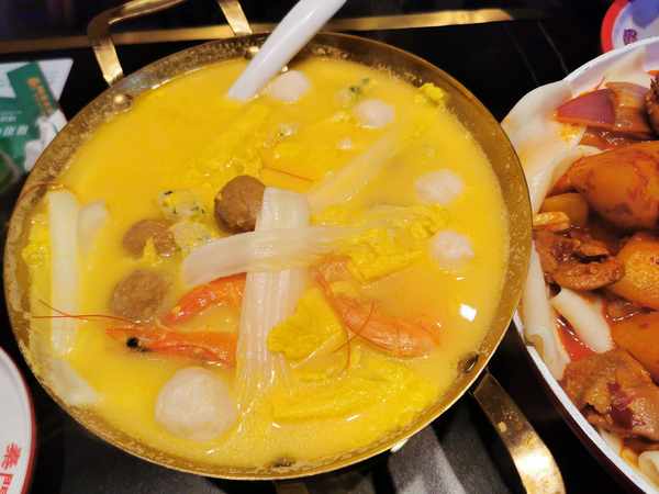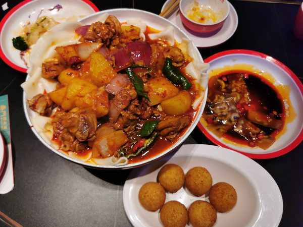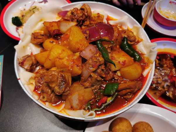 新疆的“大盘鸡”素有耳闻,没想到第一次吃竟然是在这里。我和小姑子都很期待这个菜,一上上来,我俩都惊呆了,分量超足,色泽也很明亮诱人,2个人根本吃不完。不过价格摆在那里,味道确实有些不尽人意,鸡肉吃起来很散不新鲜,辣酱放了不少,但是也不辣也不咸,每种食材各是各的味道,吃起来不入味,说不上好吃,但也不至于难吃。