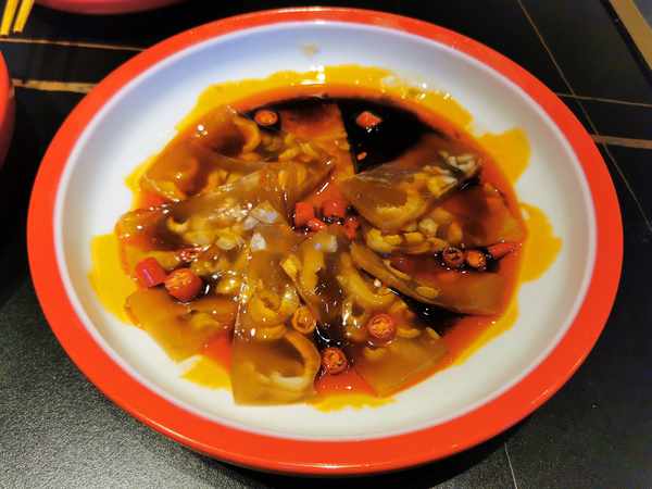 自从回到了江西,很少吃皮冻,这次套餐里正好有,终于可以大饱口福了。皮冻的口感很清爽,软嫩好嚼,搭配上红油酱汁,味道酸酸甜甜,带有一丝鲜咸,我俩三下五除二就干光了。