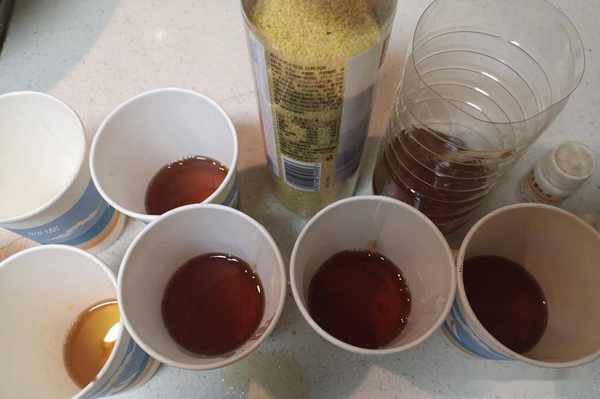 酒米一定要使用小米或者小颗粒的玉米渣,因为食物颗粒小,鲫鱼很长时间也吃不饱,这样才能长久留在窝点中。准备500克小米,20克公丁香,白酒一瓶,蜂蜜一小勺,维生素B2准备4、5颗。首先是制作药酒,把公丁香浸泡在白酒中,一周之后就可以使用,并且可以保存很长的时间。小米上锅文火略微翻炒,提升下谷物香。杯子里50-75克丁香药酒,把蜂蜜、维生素放进去溶解搅拌均匀。冷却的小米灌瓶,然后把混合好的溶液倒进去摇晃均匀,几天之后就可以使用了。