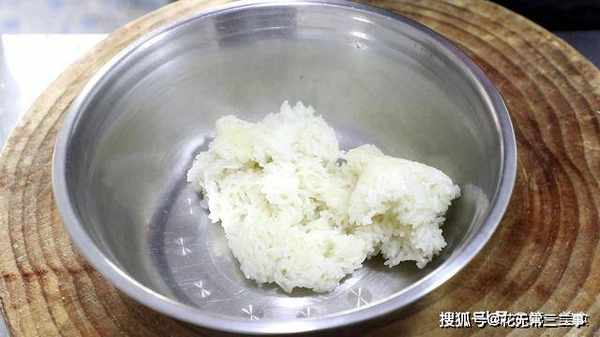 把大米倒入电煲锅中抓洗干净,然后把淘米水倒干净。淘米水控干之后,把大米铺平加入适量的清水蒸米。蒸米饭的水,以没过大米1厘米为宜,这样蒸出来的米饭颗粒分明,香糯劲道。用精煮饭模式,把大米蒸熟后,盛放在盆中晾凉备用。