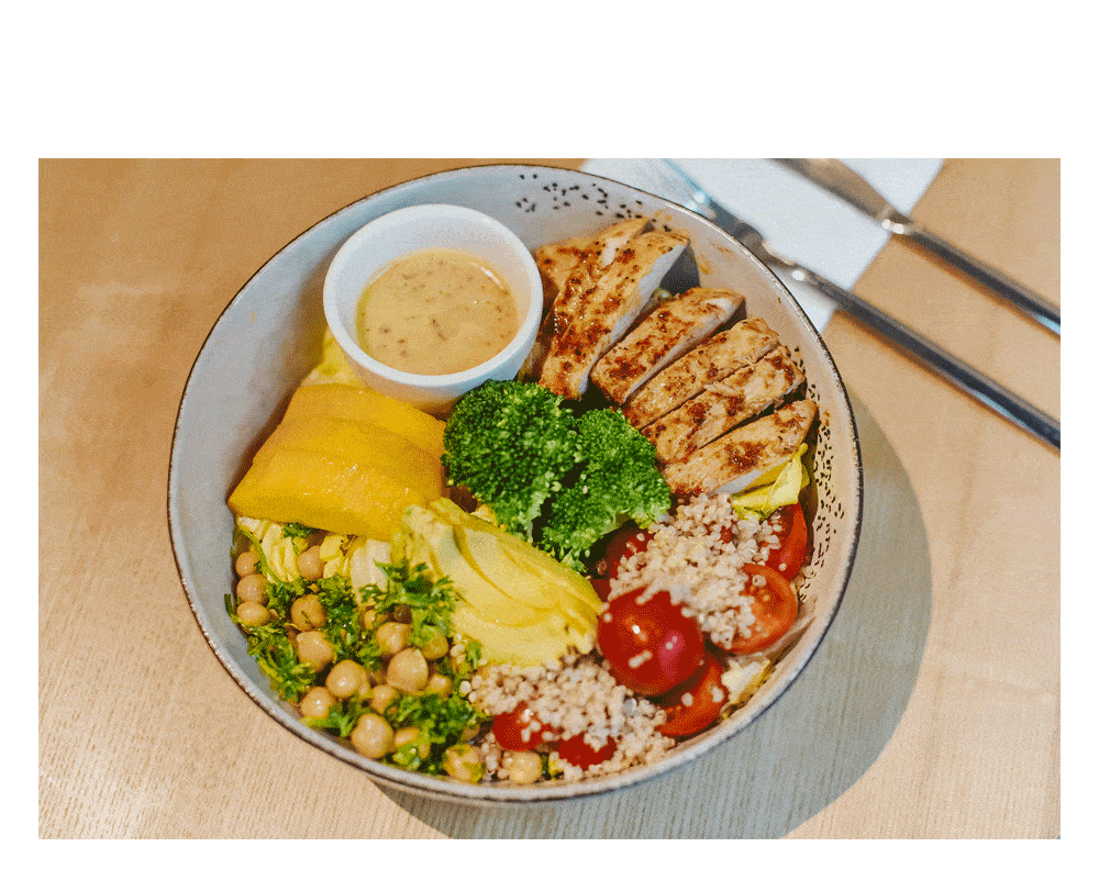 辣味鸡肉提前腌制调味,煎过之后喷香诱人,咬上去厚实又多汁!幸福感油然而生!蔬菜自然的清香在口齿间咔嚓回旋,芒果香甜,樱桃番茄会爆汁,鹰嘴豆吃起来软软糯糯,不废牙, 吃色拉也能吃饱,不用挨饿!