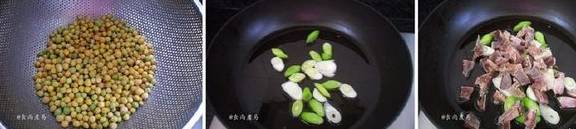 2.将豌豆捞起,沥干水。热锅倒入,下蒜梗部分爆香,倒入咸肉煸炒片刻