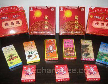 贵溪市龙兴铺生产的"铁拐李"牌灯芯糕:已有300多年的历史,以优质晚米、白糖为主要原料,配以东南亚肉桂以及丁香、当归、白芷、甘草等30多种名贵中药精工制作而成,是江南四大名特糕点之一。清代列为贡品,曾被乾隆皇帝誉为"京省弛名,独此一家"。