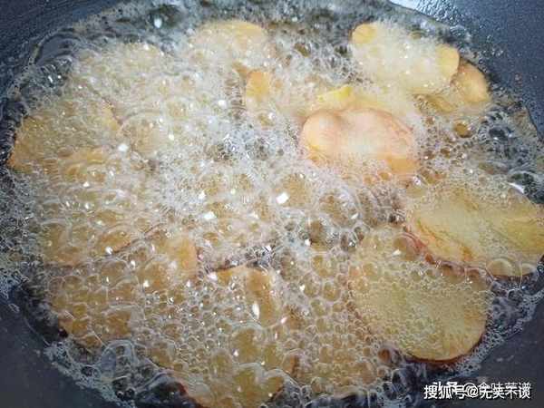 3、锅内烧油,等待油温5成热,下入晾干的地瓜片小火慢炸,把水分完全炸掉。