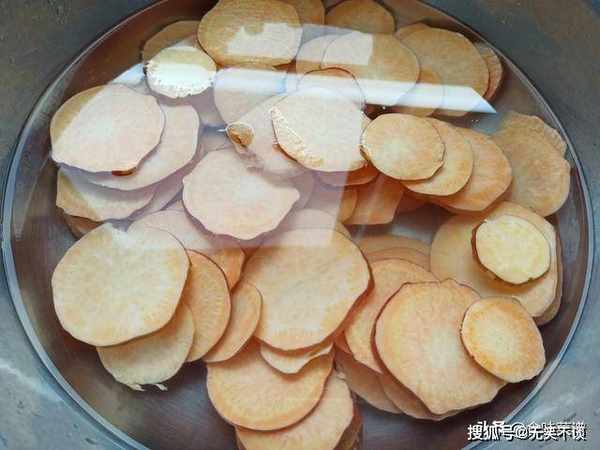 1、先把地瓜好好清洗一下,无需去皮,直接切成薄片,如果有擦片器会更方便,放入水中,浸泡一会儿,去掉里面的淀粉。