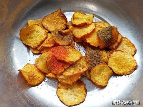 5、准备一个空盆,擦干别带水分,倒入炸好的地瓜片,趁热撒上孜然粉、辣椒面,抓起盆子颠匀,装盘开吃,如果不能吃辣,可提前挑出一些不放辣椒。