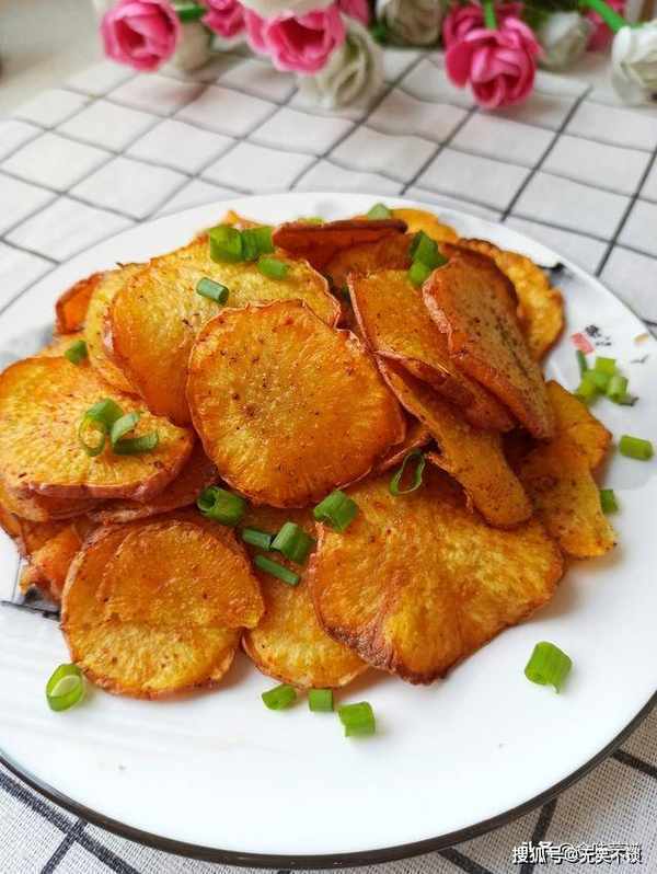 6、一道简单好吃地瓜片就做好了,撒些小葱点缀一下,端上桌就是一道不错的下酒菜,酥脆可口,剩下的用保鲜袋封存一下,留着下次吃。