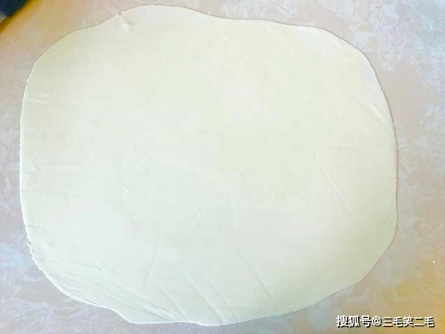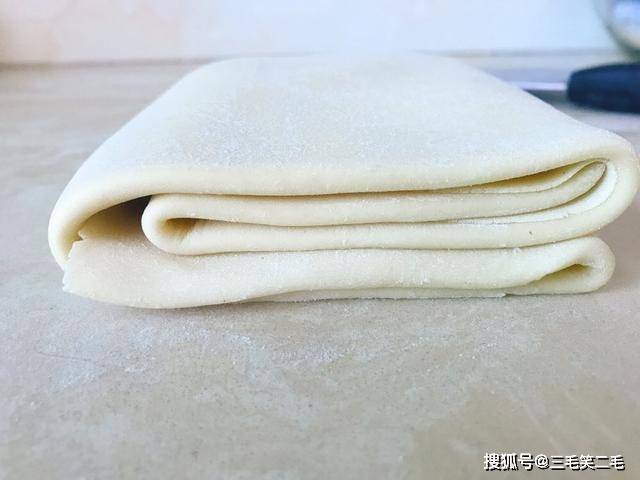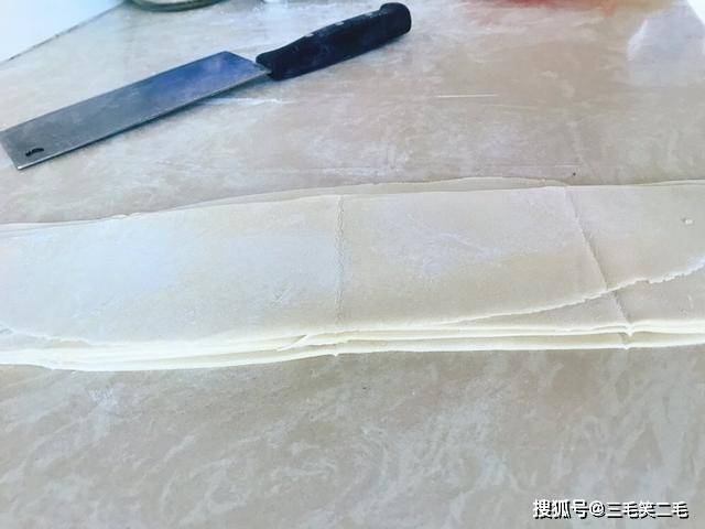 2、方形薄片折的时候,要给每个接触面都撒上(玉米)淀粉防粘,哪里缺往哪边擀,尽量薄一些。