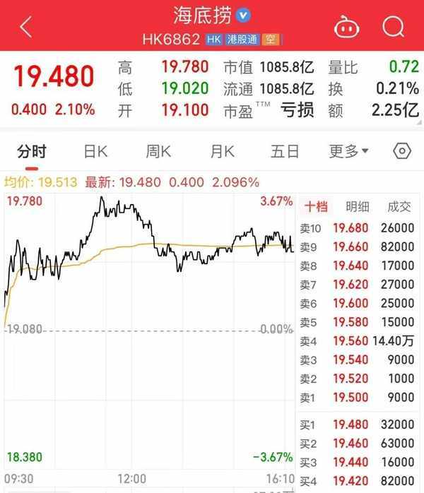 截至今日港股收盘,海底捞(HK6862)股价19.46港元,上涨2.10%,市值1085.8亿港元。