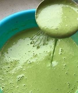 加入两个鸡蛋以及盐,搅匀!在这里说一下盐不一定非得是4g,自行斟酌,不需要煎饼非得有盐味我是菠菜多完全用的菠菜汁,也可以一杯菠菜汁然后加水