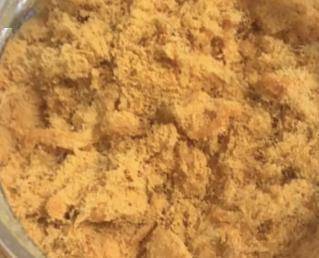 而添加熟豆粉的肉粉松颜色往往是里面较浅白,外面颜色较重,可以明显看到粉状物,手一捏就粘在一起。
