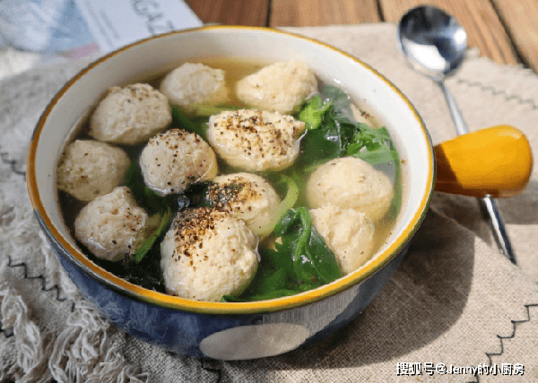 有浮沫时撇掉,再转中火煮到丸子熟透。最后倒入菠菜搅拌均匀,再加入盐、白胡椒粉、香油调味,这道低脂餐就做好了。