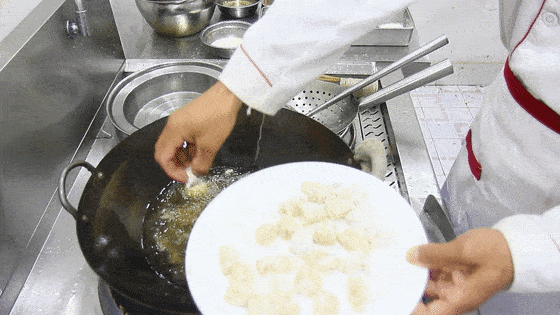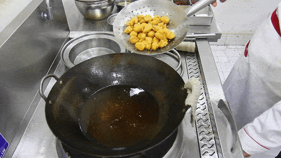 油温回升至6成热后把肉丁倒入复炸20秒