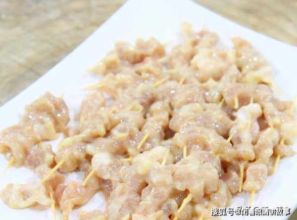 然后准备一些牙签,每个牙签串两粒到三粒猪肉,全部串好备用。
