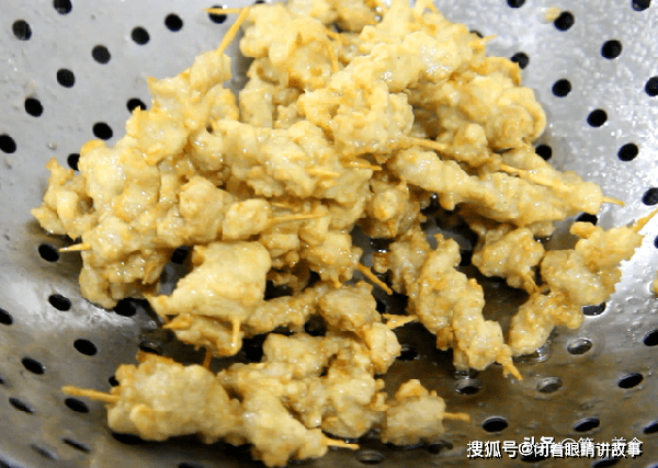 锅里烧油,烧至5成热时倒入牙签肉,用勺子轻轻打散避免粘连,保持中小火把牙签肉炸到金黄色后捞出控油。