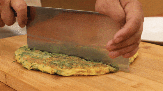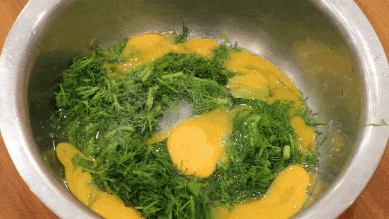 首先我们取一把小茴香,洗净之后把茴香切碎放入盆中。之后在盆中打入4个鸡蛋,加入2克食盐,搅拌均匀之后备用。