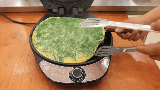 电饼铛预热2分钟,先均匀的刷上植物油,再把小茴香蛋液倒入锅中。盖上锅盖烙3分钟左右,等蛋液定型以后,我们用刀或者盘子,把饼翻一下面。这时你能看到,饼的底面已经烙成金黄色了。保持小火再烙一分钟,等饼两面都呈金黄色时即可出锅。