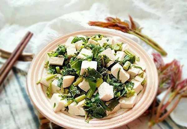 制作方法:香椿一把摘洗干净,锅中水开后加入少许盐和油倒入香椿焯一水,这样的方法可以去除掉香椿的苦涩味,捞出后过一下凉水拧干水分切成小碎块备用,嫩豆腐一块蒸熟切成小块装盘,待放凉后撒上香椿,再倒入少许生抽,胡椒粉和香油轻轻拌均匀即成鲜香味十足的香椿拌豆腐。