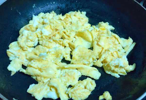 (3)碗中打入两个鸡蛋搅散,加一丢丢盐调个底味,油热倒进锅里炒熟,然后盛出来备用