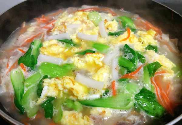 (5)紧接着倒入1大碗开水,加盐,味精调个味道,煮开后倒入青菜和炒好的鸡蛋,再煮1分钟出锅