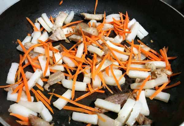 (4)另起锅倒油,先放猪肉炒香,然后加胡萝卜和年糕翻炒片刻