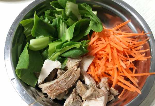 (2)接着把上海青洗干净切成小段,胡萝卜一截擦成细丝,猪肉切成小块,我这里准备的熟猪肉,换成生肉也可以,主要是起增香的作用