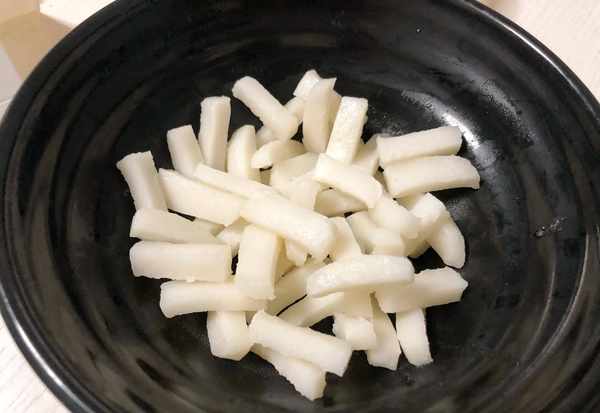 (1)首先将年糕切成薄片,然后每片再切成细条
