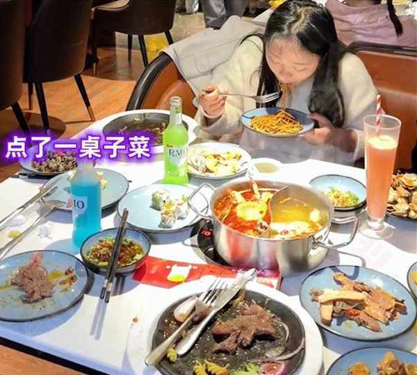 只见女生点了满满当当一桌子菜,桌上已经放着两瓶饮料,女生还格外再给自己点了一杯。这并不算什么,关键是男子只是客气客气,女生还真就当真,一个人埋头干饭。