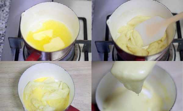 1:制作泡芙是需要先将面糊烫熟,在这里建议大家用厚一点的锅来做