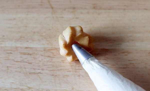 5:用曲奇花嘴将泡芙糊挤在模具上