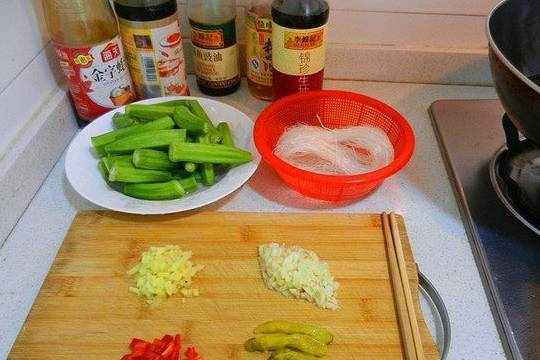 秋葵500克、细粉丝200克、姜3克、蒜3克、红辣椒2克、泡椒4克、麻油1茶匙、酱油1茶匙、生抽1茶匙