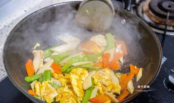 4、锅内所有材料炒香后,可以加入鸡蛋炒香,再加入少量生抽、骨汤和食盐调味,炒出香味即可从锅里享受它。