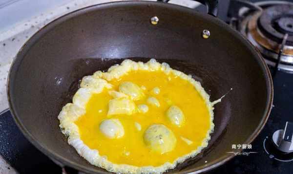 2、将锅洗净,然后加入食用油,将所有的鸡蛋搅拌均匀,然后倒入锅中,将蛋液煎至凝固,然后分成小块出锅待用。.